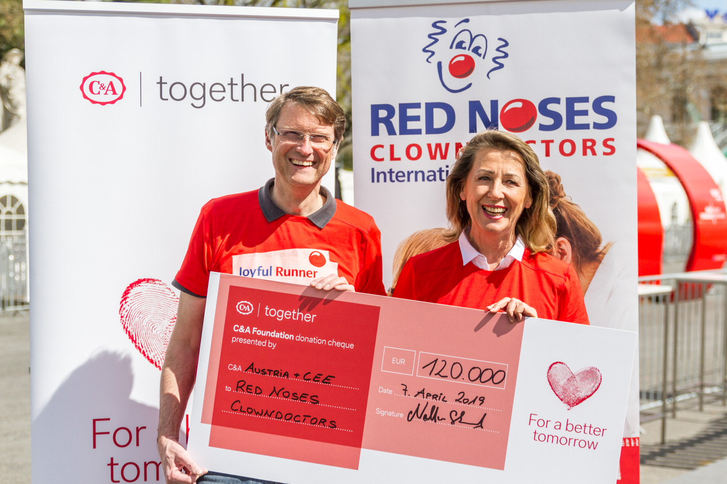 Doing sports makes people happy. Clowns bring humour and laughter. Both motivate and promote social interactions and emotional well-being. For this reason, 128 C&A employees showed, for the fourth year consecutive, their commitment at the Vienna City Marathon 2019. The C&A Foundation is donating a total of € 120,000 to RED NOSES International (RNI) for the "Intensive Smile" project in Austria and six other countries.