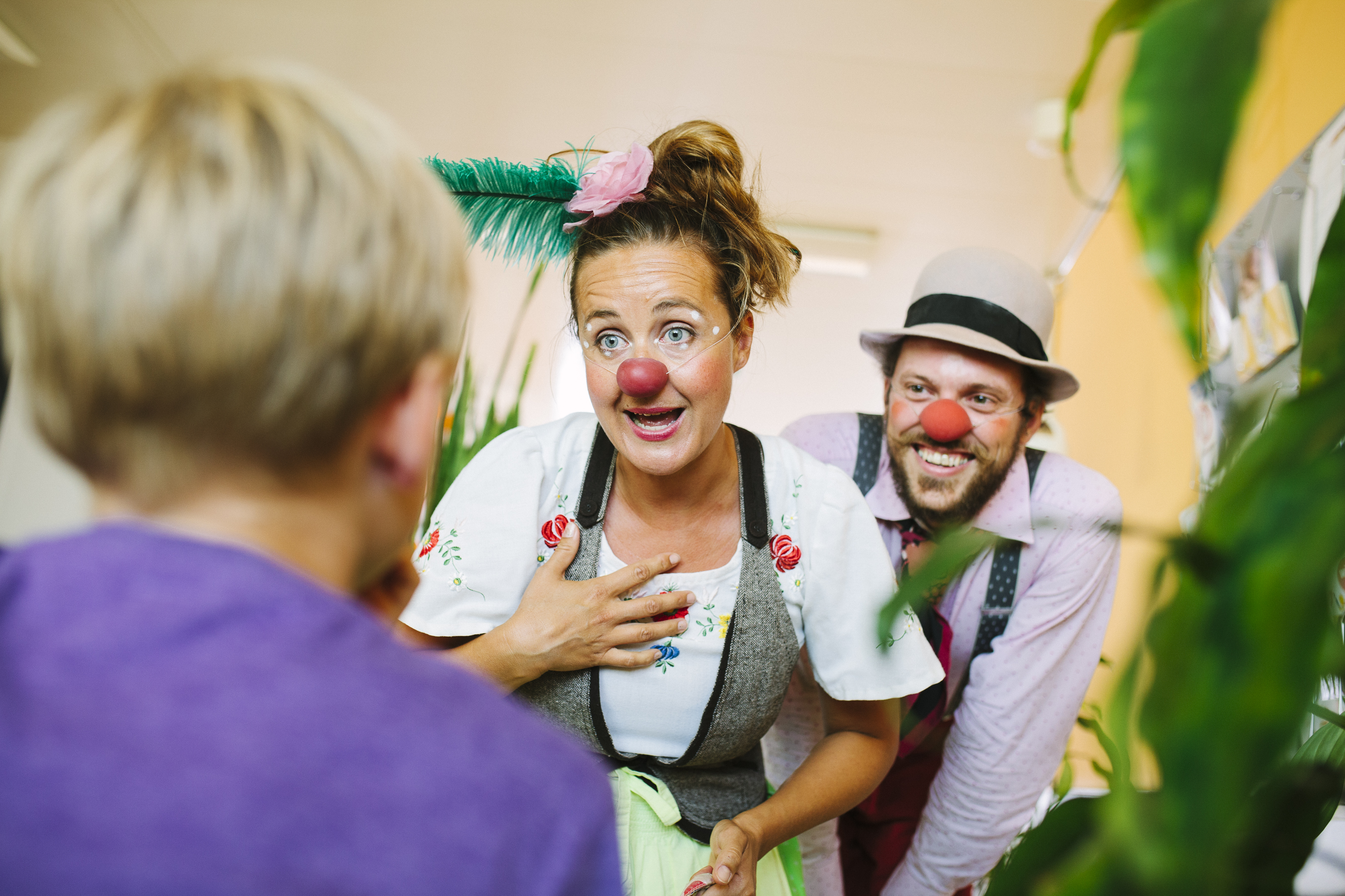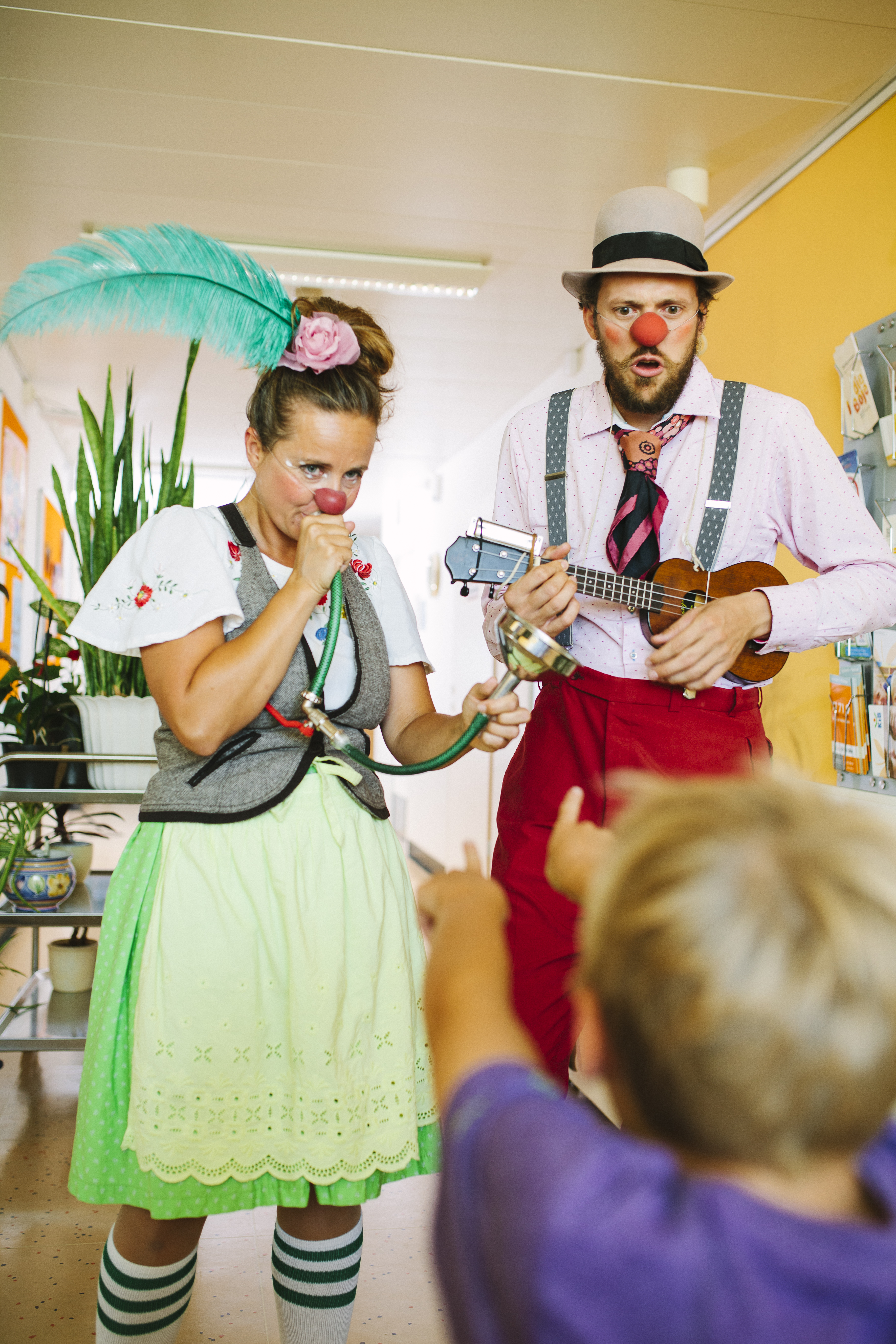 We, the clowns Dr. Vincenzo and Dr. Dagmar, found 9-year-old Marcel crouching on a chair, sitting immersed in himself. His body language portrays a picture of misery. Introverted, he gazes half out of the window, half staring at the wall. He suddenly registers that we are present, but isn’t quite sure what’s happening and how to react. After all, two clowns are standing right on his doorstep. Marcel’s realm of emotions wavers between insecurity, withdrawal and amazement.