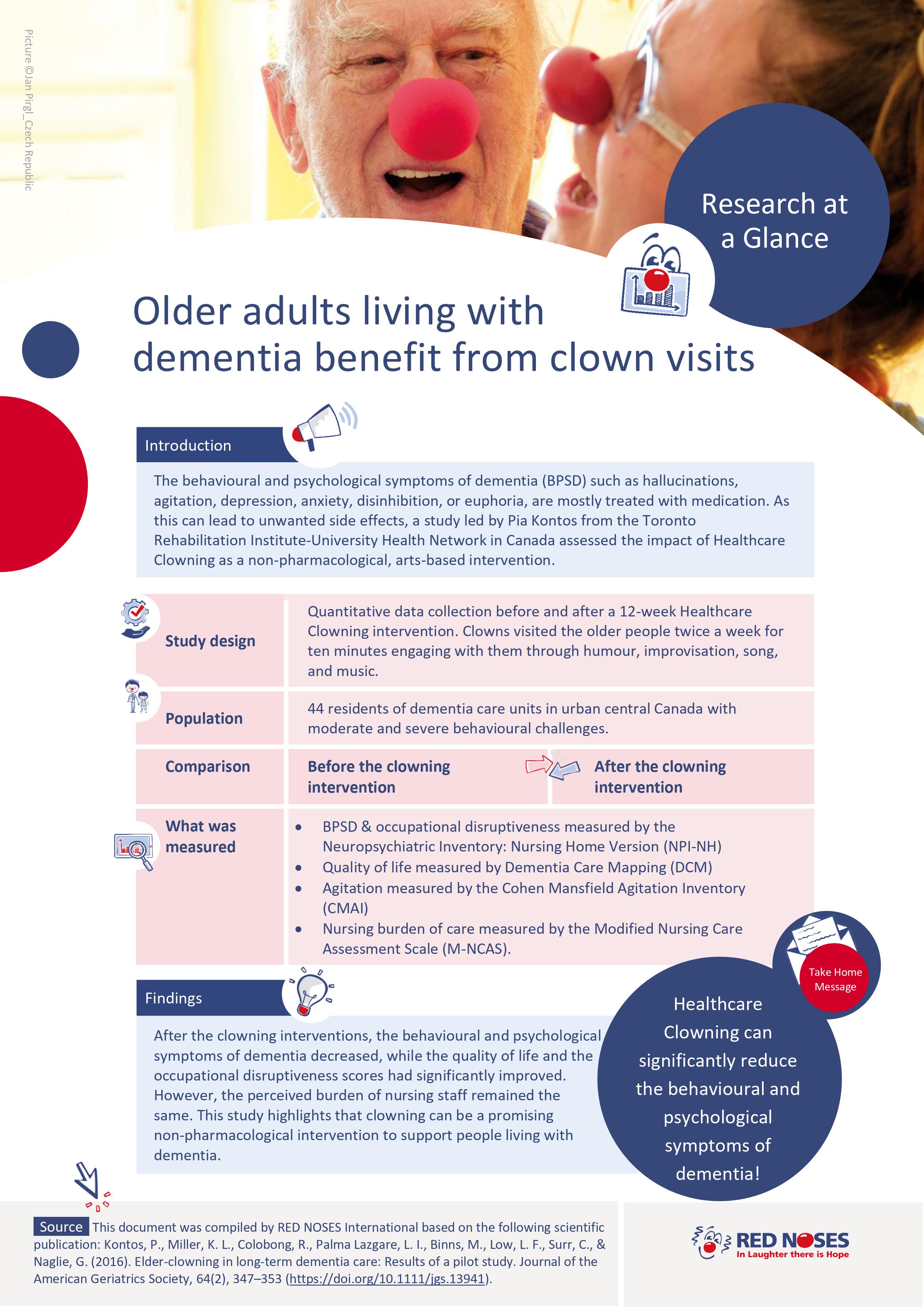 This Research Nugget collates scientific evidence, highlighting the versatile positive impacts healthcare clowning can have on the physical and mental well-being of older people in care homes, on people living with dementia, and in the context of palliative, end of life care for older adults.